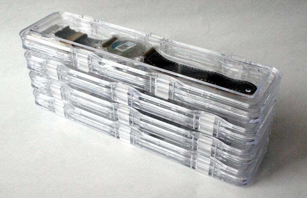 ケースに埋め込まれた2つの弾性フィルムは、時計を埃や塵から守り、空中で優しく包み保持して(真空梱包)セキュリティを強化します。