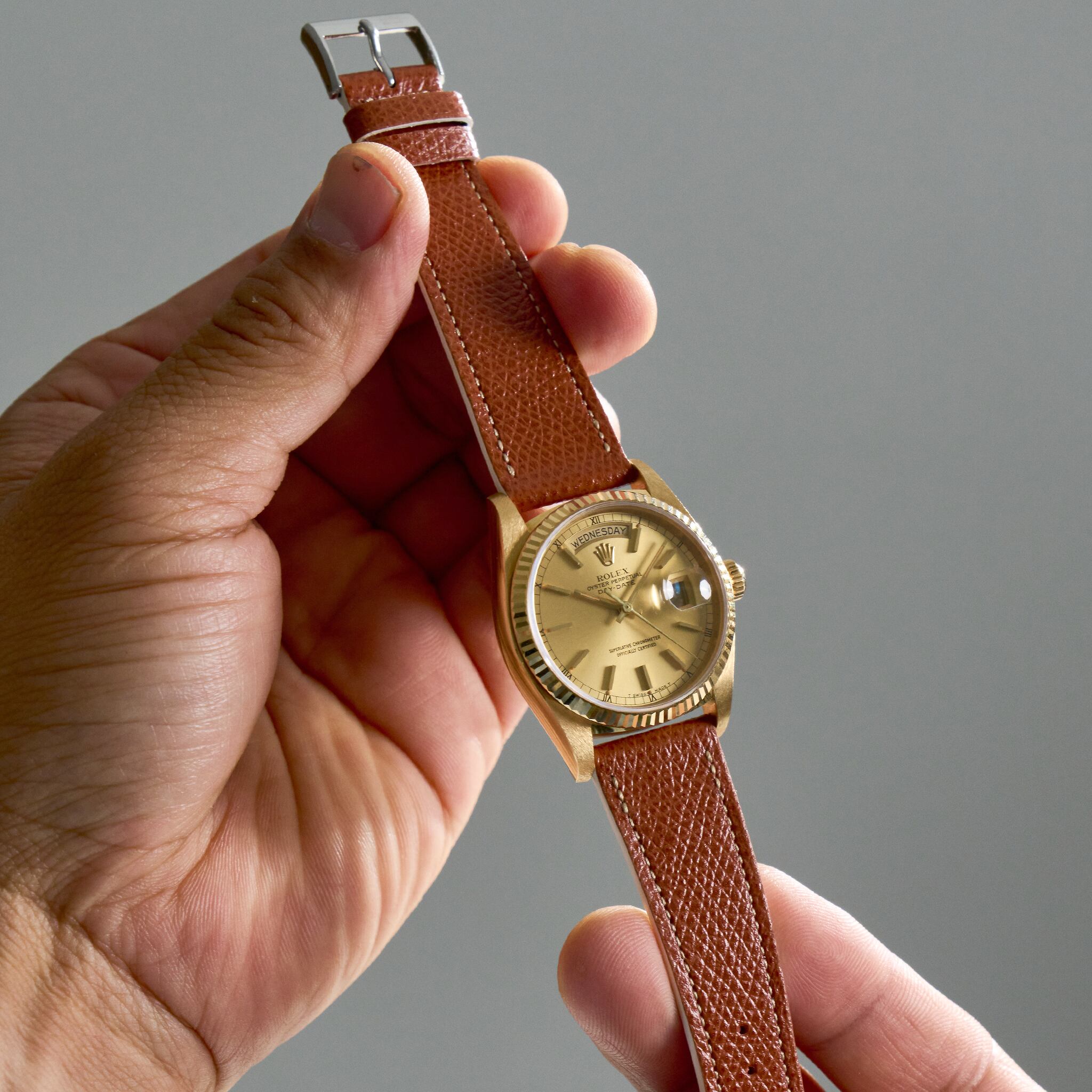 NOSTIMEストラップのデザインは1950年代時計革命時に作られたストラップをイメージしております。薄く、テーパー状の外観は、マイクロステッチを施し、カーフスキンとアンティークレザーを使用しております。NOSTIMEストラップはヴィンテージはもちろんコンテンポラリーのタイムピースをも引き立たせます。