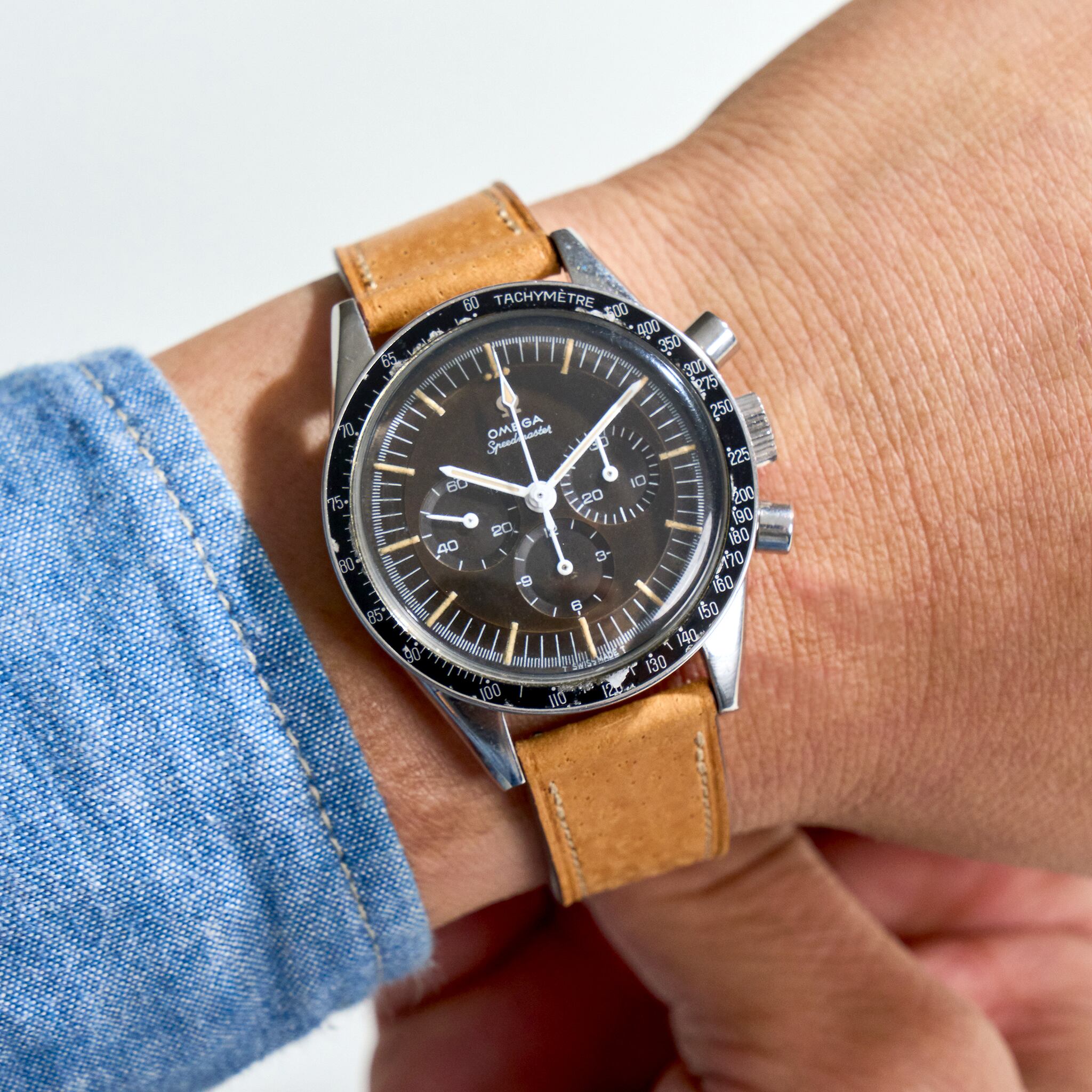 NOSTIMEストラップのデザインは1950年代時計革命時に作られたストラップをイメージしております。薄く、テーパー状の外観は、マイクロステッチを施し、カーフスキンとアンティークレザーを使用しております。NOSTIMEストラップはヴィンテージはもちろんコンテンポラリーのタイムピースをも引き立たせます。
