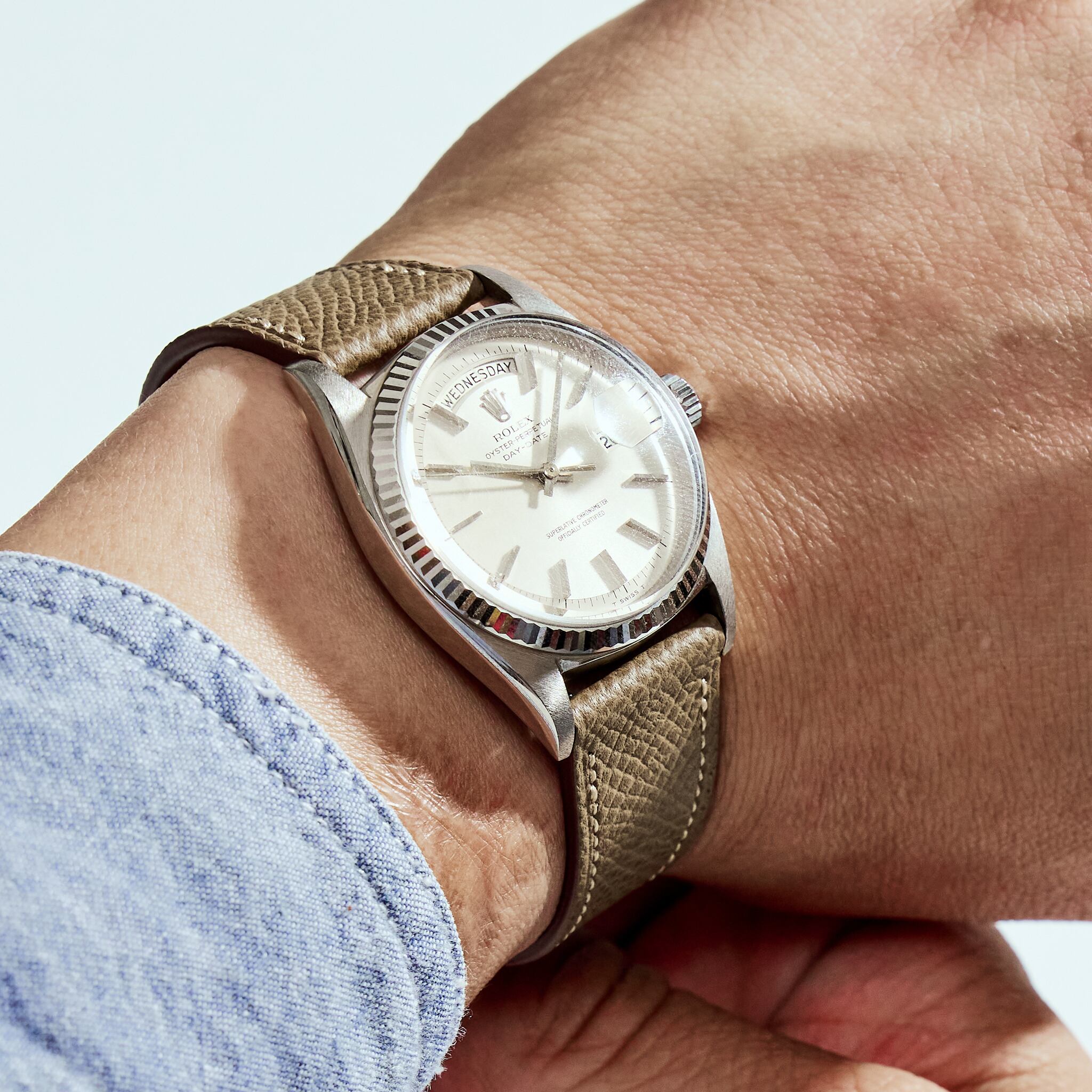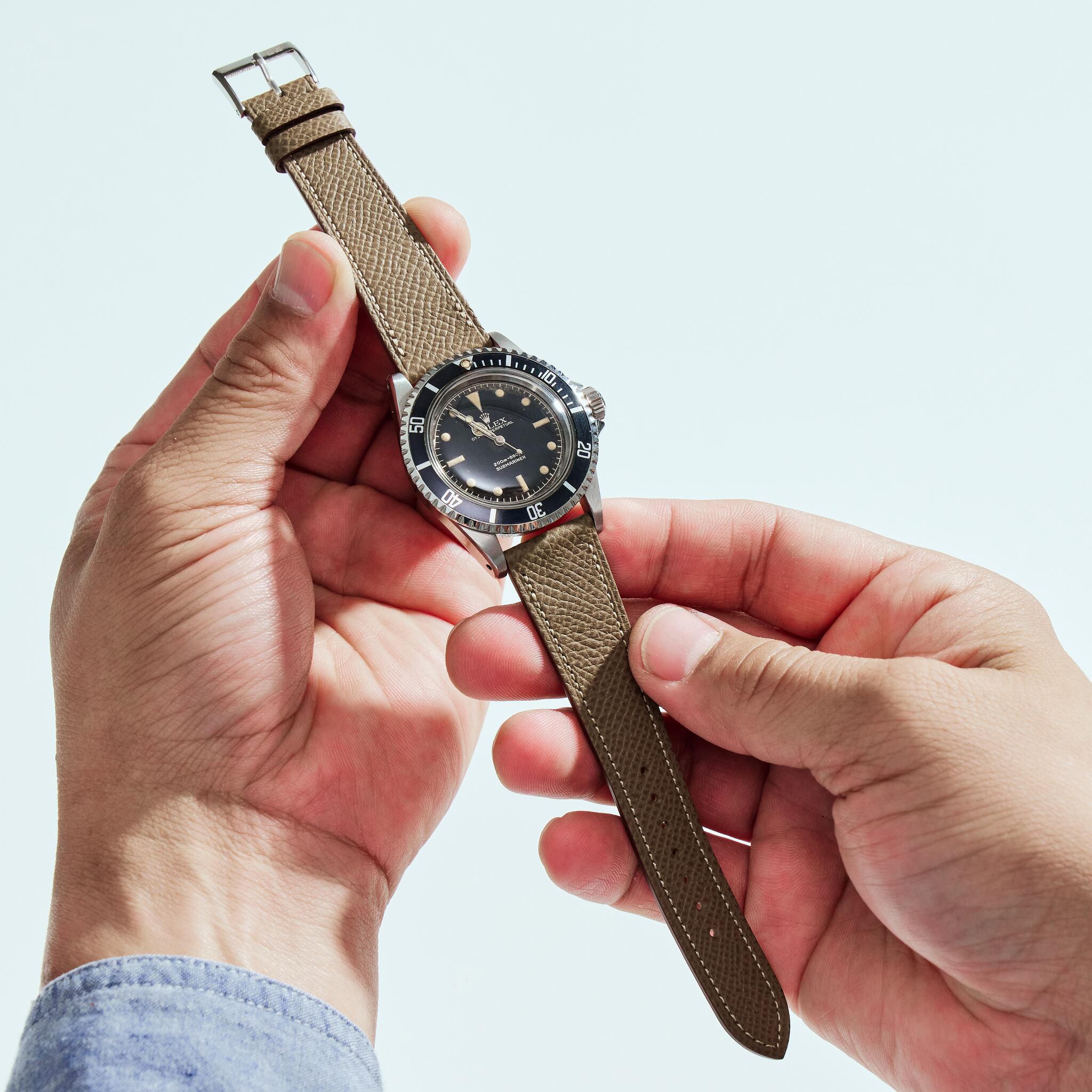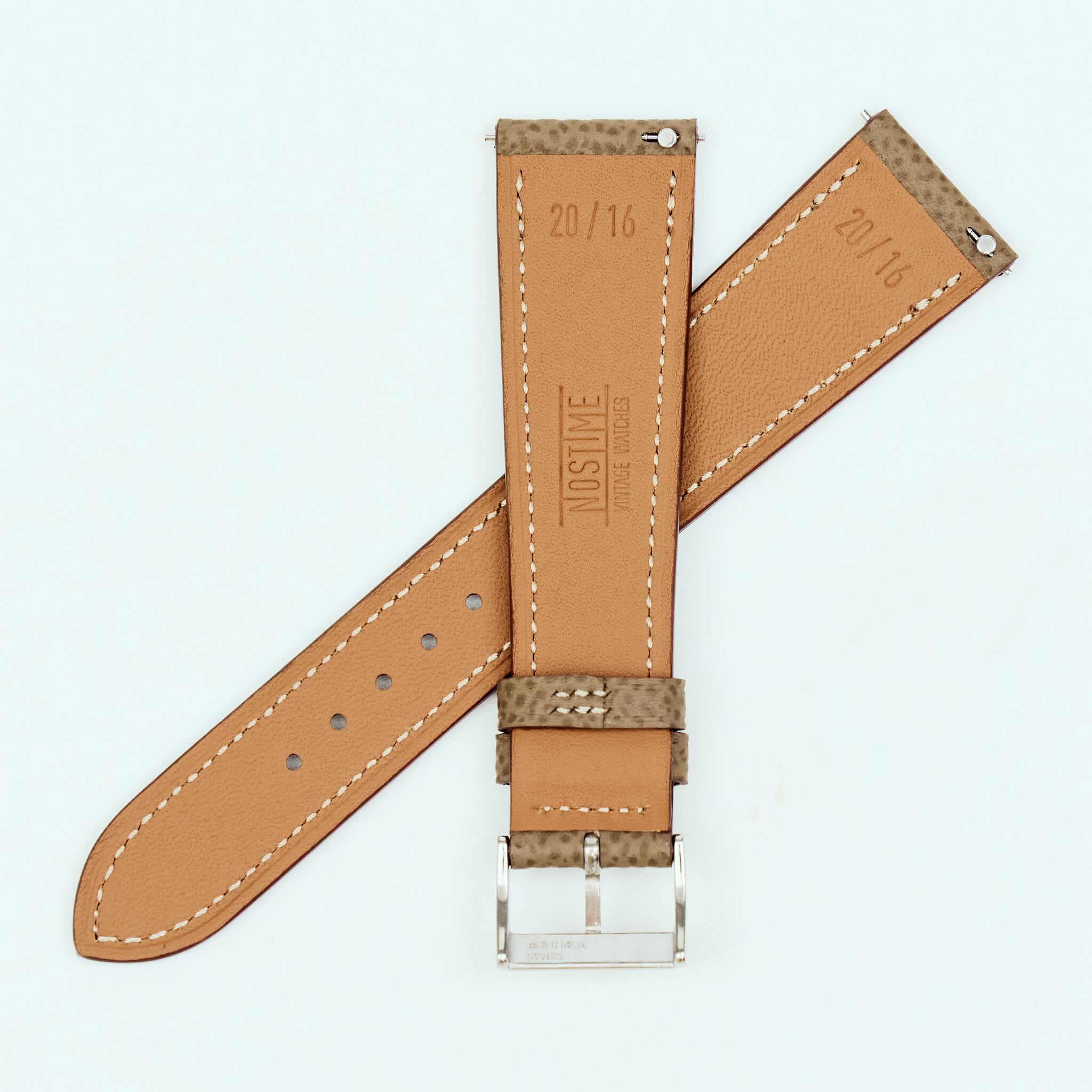 NOSTIMEストラップのデザインは1950年代時計革命時に作られたストラップをイメージしております。薄く、テーパー状の外観は、マイクロステッチを施し、カーフスキンとアンティークレザーを使用しております。NOSTIMEストラップはヴィンテージはもちろんコンテンポラリーのタイムピースをも引き立たせます。