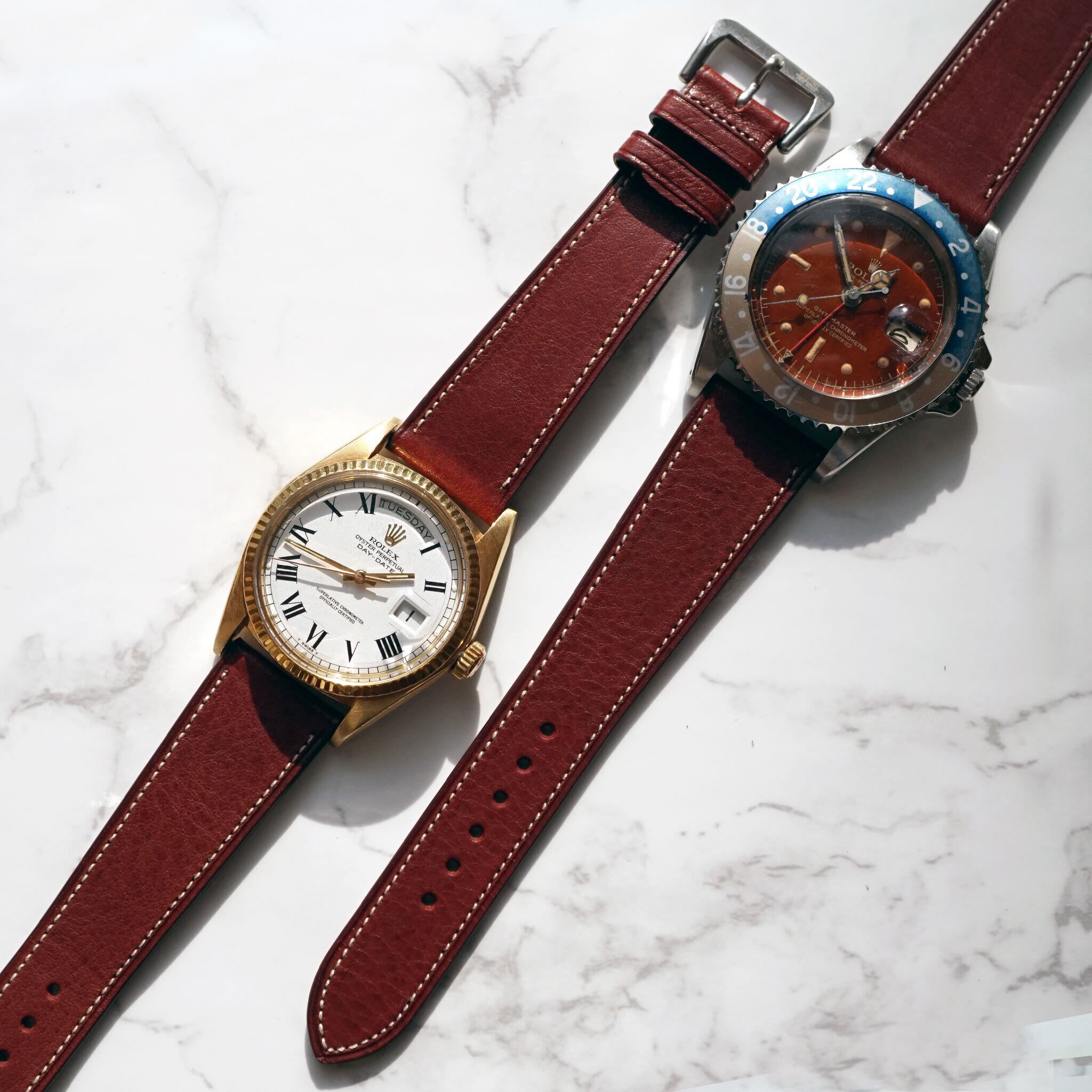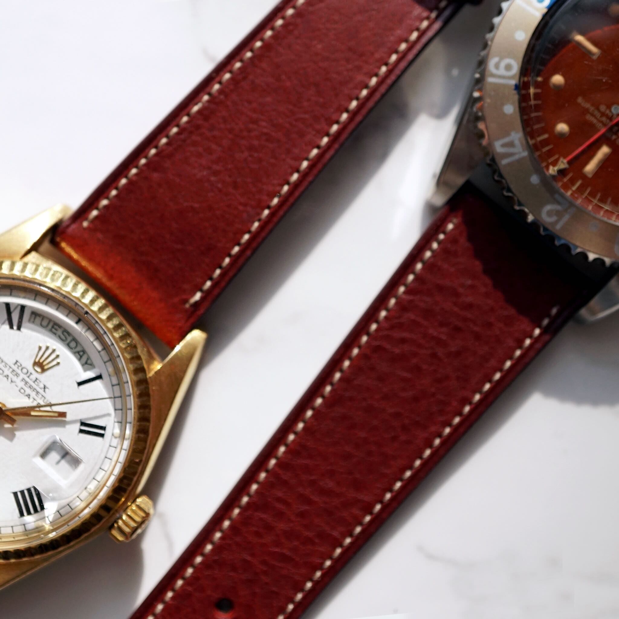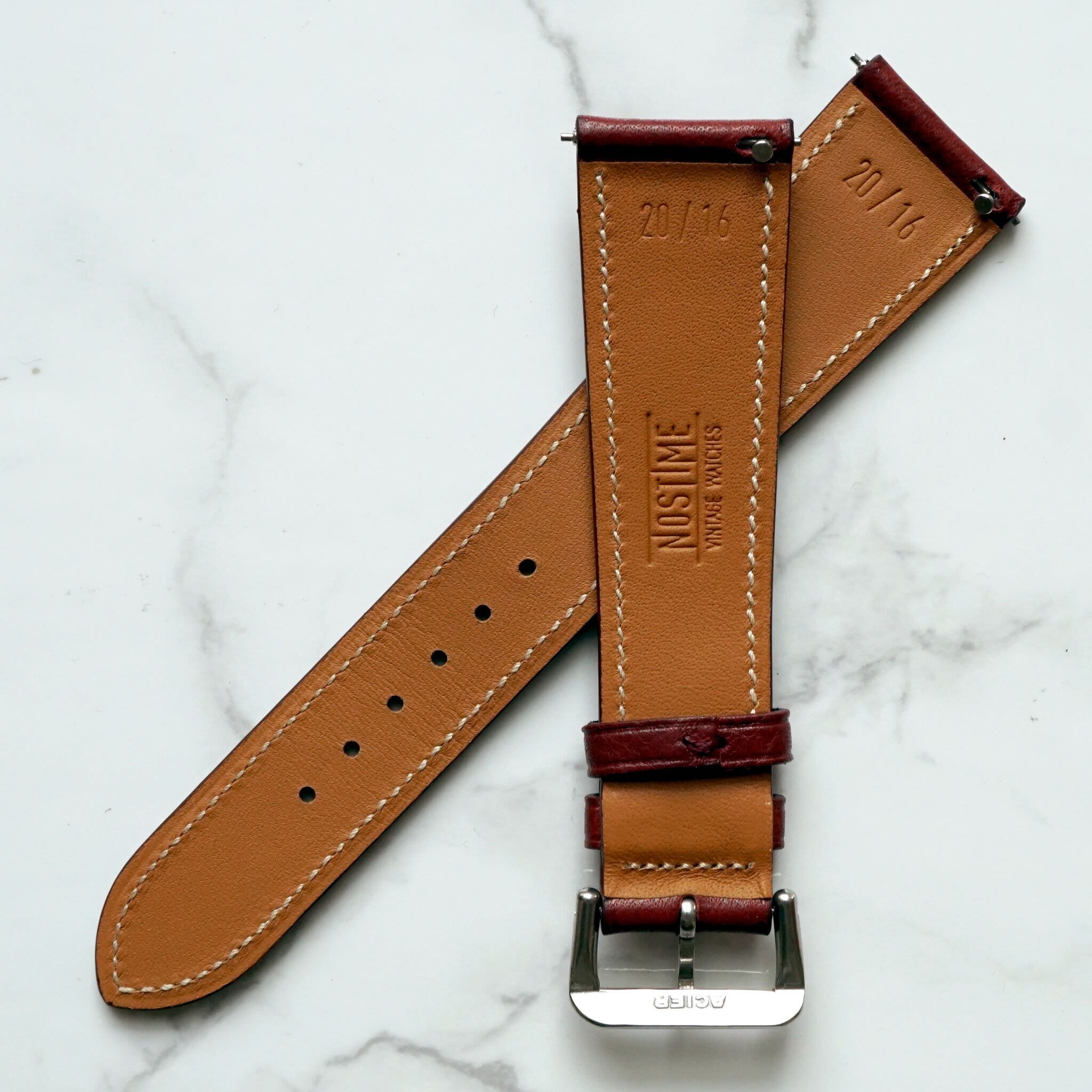 NOSTIMEストラップのデザインは1950年代時計革命時に作られたストラップをイメージしております。薄く、テーパー状の外観は、マイクロステッチを施し、カーフスキンとアンティークレザーを使用しております。NOSTIMEストラップはヴィンテージはもちろんコンテンポラリーのタイムピースをも引き立たせます。