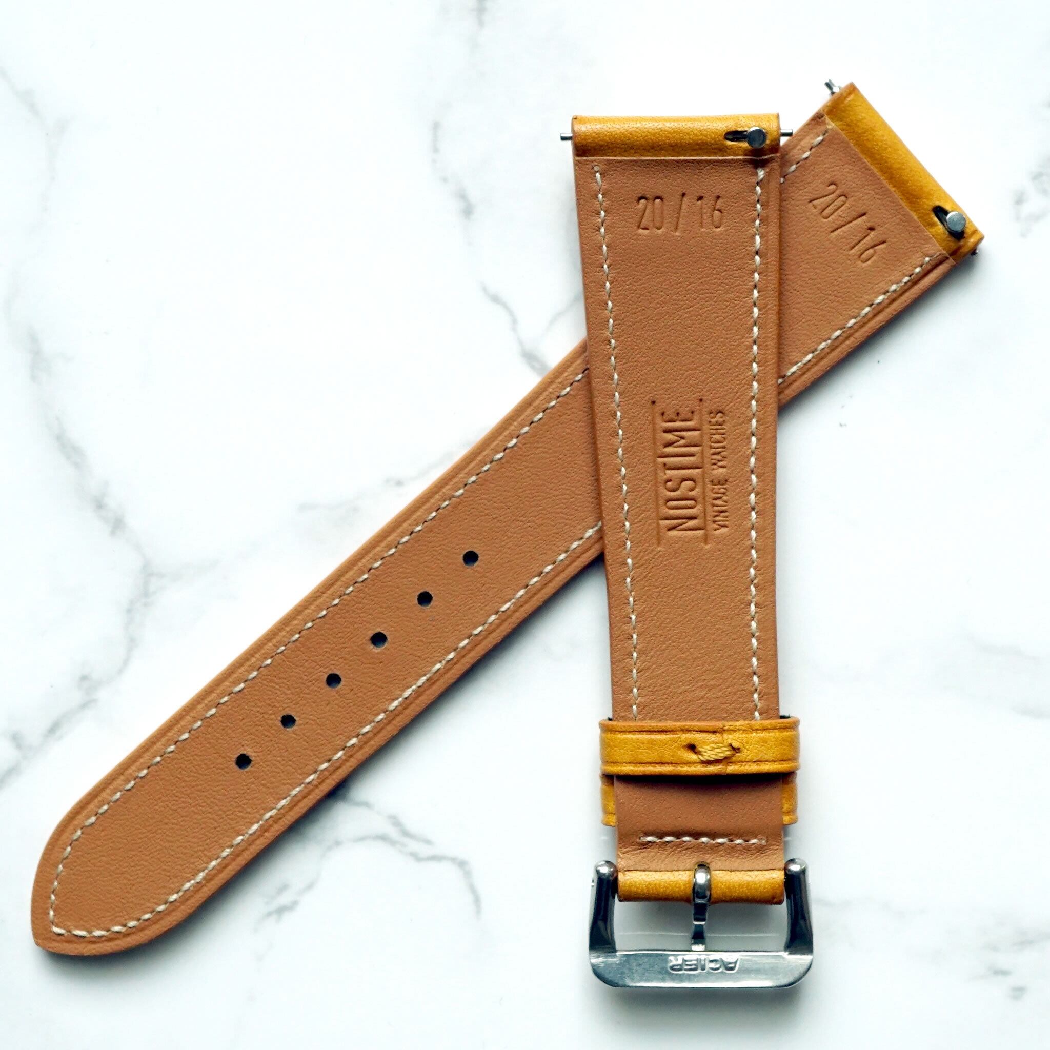 NOSTIMEストラップのデザインは1950年代時計革命時に作られたストラップをイメージしております。薄く、テーパー状の外観は、マイクロステッチを施し、カーフスキンとアンティークレザーを使用しております。NOSTIMEストラップはヴィンテージはもちろんコンテンポラリーのタイムピースをも引き立たせます。