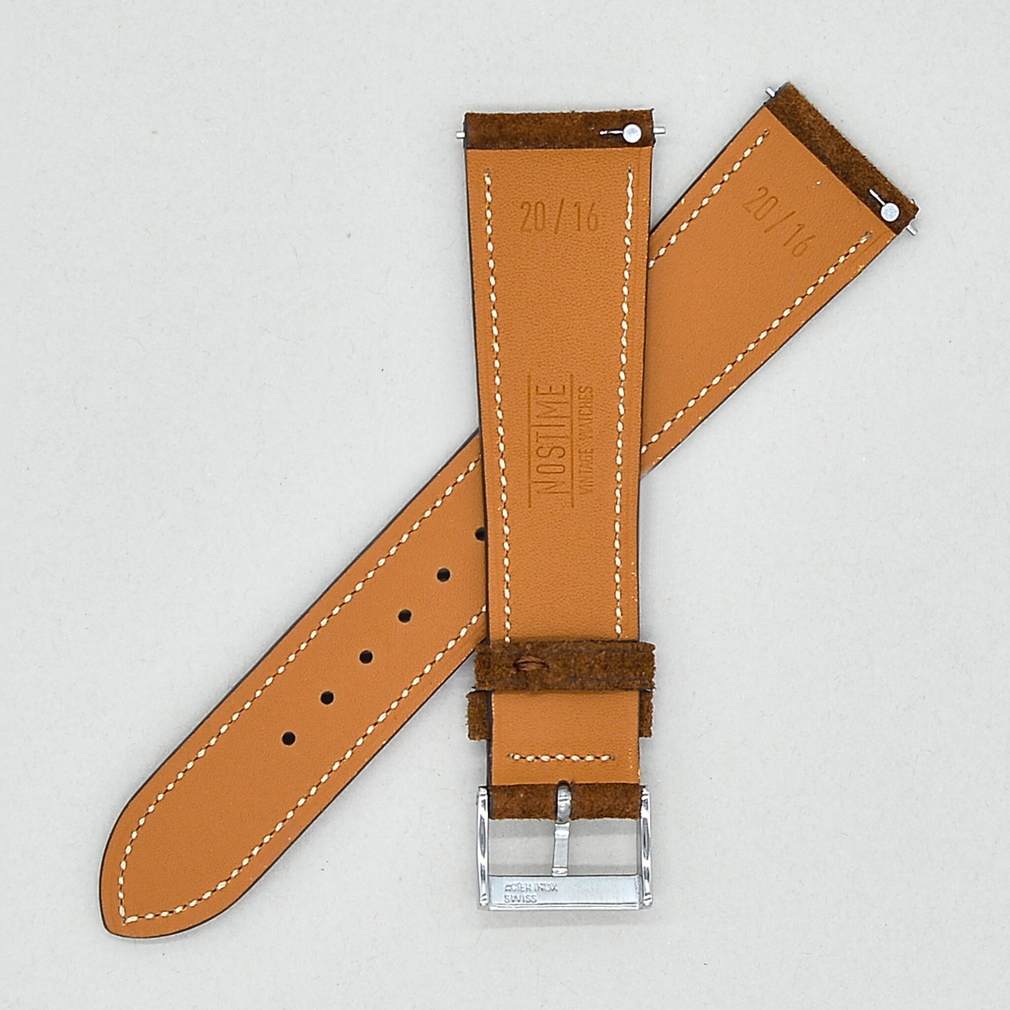 NOSTIMEストラップのデザインは1950年代時計革命時に作られたストラップをイメージしております。薄く、テーパー状の外観は、マイクロステッチを施し、カーフスキンとアンティークレザーを使用しております。NOSTIMEストラップはヴィンテージはもちろんコンテンポラリーのタイムピースをも引き立たせます。
