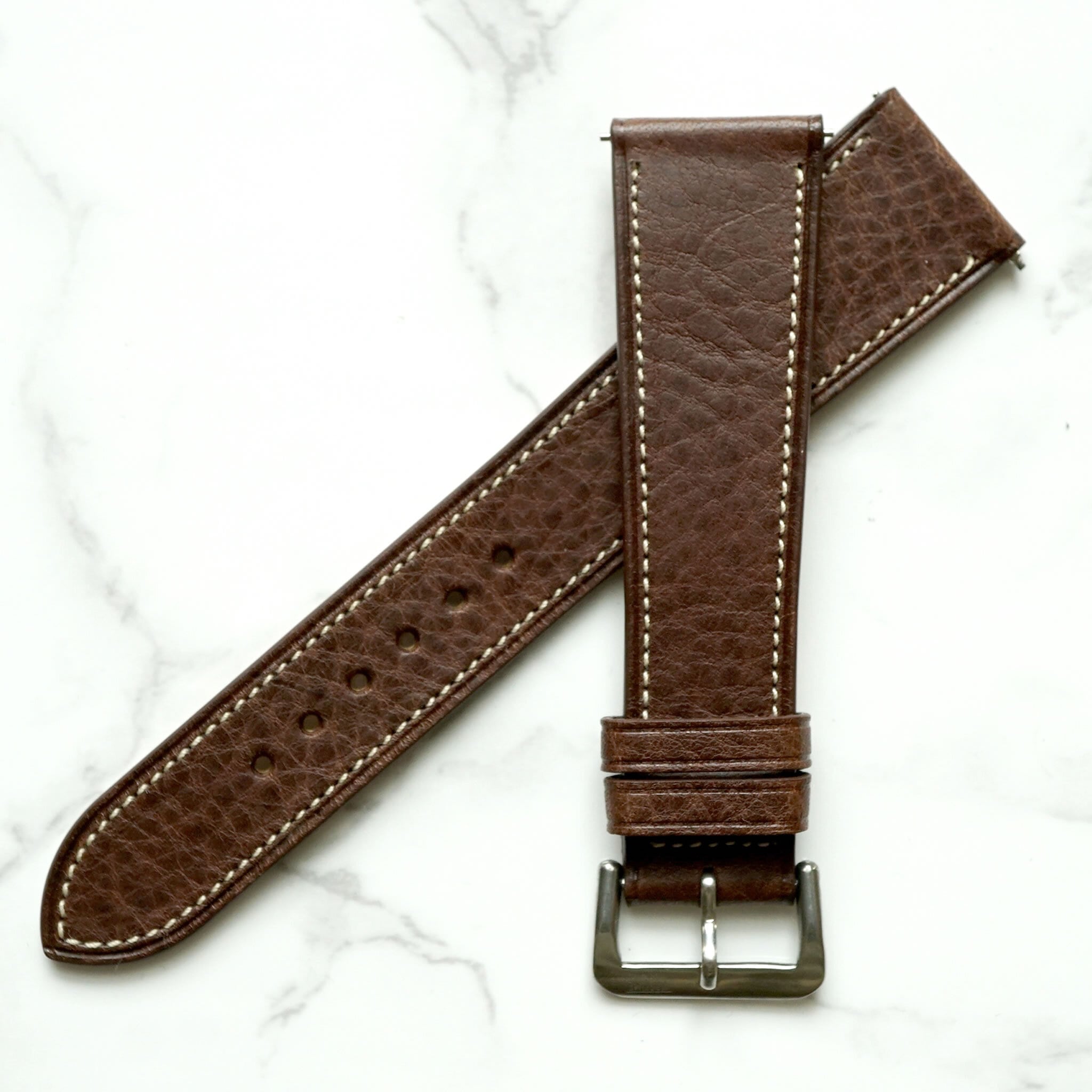 NOSTIMEストラップのデザインは1950年代時計革命時に作られたストラップをイメージしております。薄く、テーパー状の外観は、マイクロステッチを施し、カーフスキンとアンティークレザーを使用しております。NOSTIMEストラップはヴィンテージはもちろんコンテンポラリーのタイムピースをも引き立たせます。